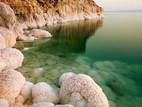 The Dead Sea, a salt lake between Israel and Jordan. It is said to be the lowest point on Earth with 420 meters below sea level. The sea is called 'Dead' because of high salinity means no macroscopic aquatic organisms such as fish or water plants can live in it.